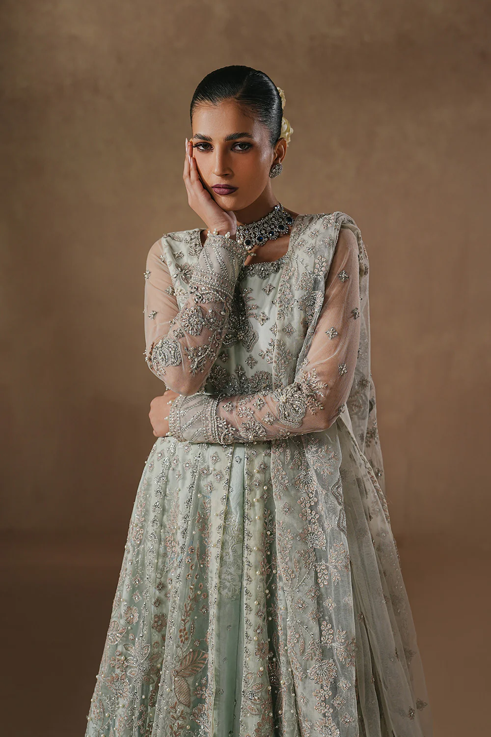 Step into refined elegance with this Ice Blue 3-Piece Pret, designed to captivate with every detail. The Bareeze Net maxi features a front-open, long flared angrakha-inspired silhouette for a regal flow. A wide round neckline highlights a fully embroidered bodice, enriched with intricate adda work. Full-length straight sleeves are adorned with all-over embroidery, finished with delicately embellished cuffs. The shirt is completed with a wide, heavily embroidered hem for a statement finish. Paired with a grip flared lehenga, screen printed and enhanced with embroidery detailing along the hem. The Bareeze Net dupatta is fully embroidered, framed with elegant scalloped embroidered borders. A graceful ensemble perfect for festive occasions and elevated evening wear.